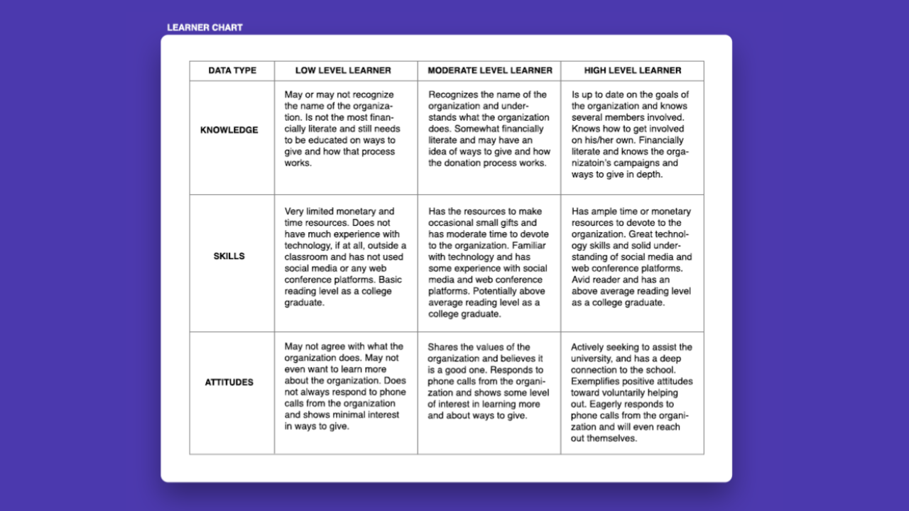 For this milestone, we were to create a learner profile and learner chart using MS Word or MS PowerPoint. The purpose of it was to report the findings of our target population, uncovered during the data collection process. We collected our data during our meetings with the client, using an interview format with questions and notetaking. The client also provided a donor commitment continuum to help us get a better understanding of our learners (the donors). This contiuum will be kept confidential, but I have included the PowerPoint from our submission of this assignment below.