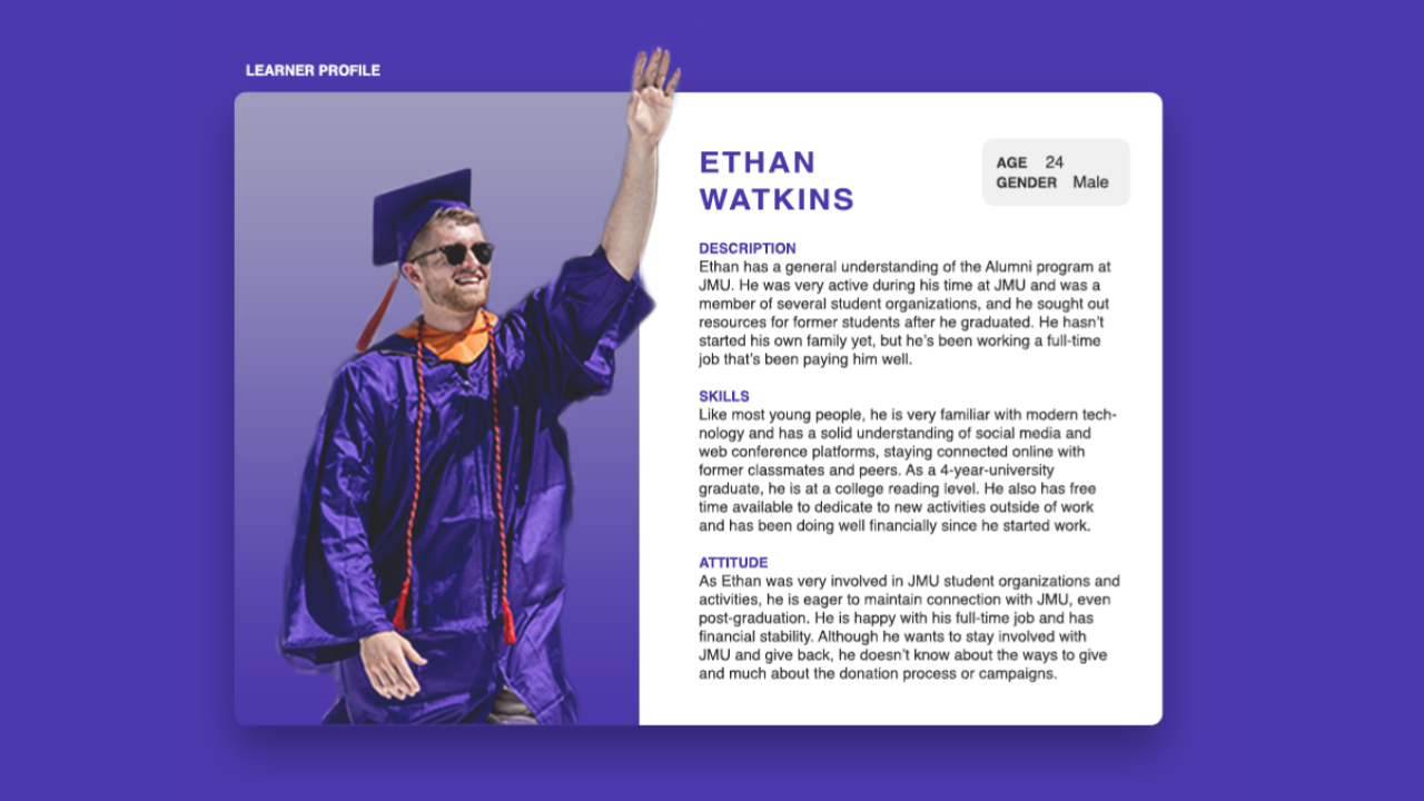 As an Educational Media minor, one of the higher level classes I was required to take for graduation was LTLE 385, which is the minor's capstone course. My classmates and I were divided into four groups of three members. Ashley Wenger, a junior marketing major and educational media minor, and Kyle Wittkowski, a senior communications major and educational minor, were my assigned teammates. Our client was the James Madison University Department of Strategic Gifts, and our assignment was to help their department with their instructional design needs by delivering a product (such as a website, presentation, or form of multimedia). Due to the COVID-19 pandemic, this entire project was completed virtually, and communication was done through email, Zoom calls, and FaceTime calls. My teammates and I collaborated on our work using Google Drive and Canva.